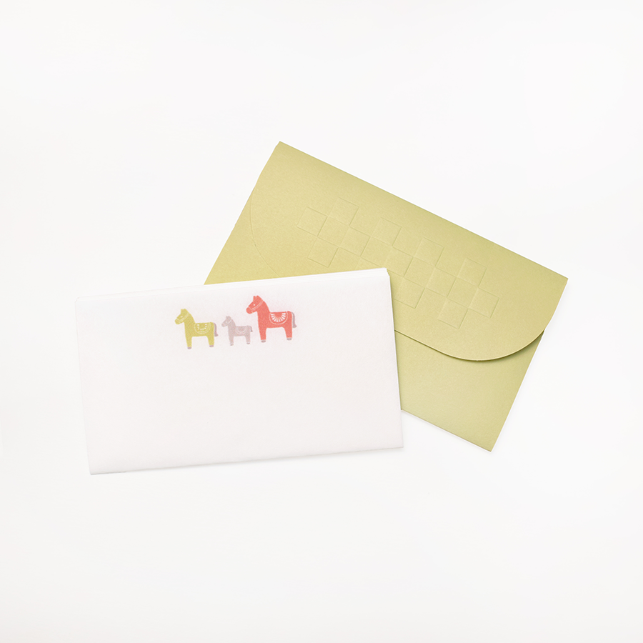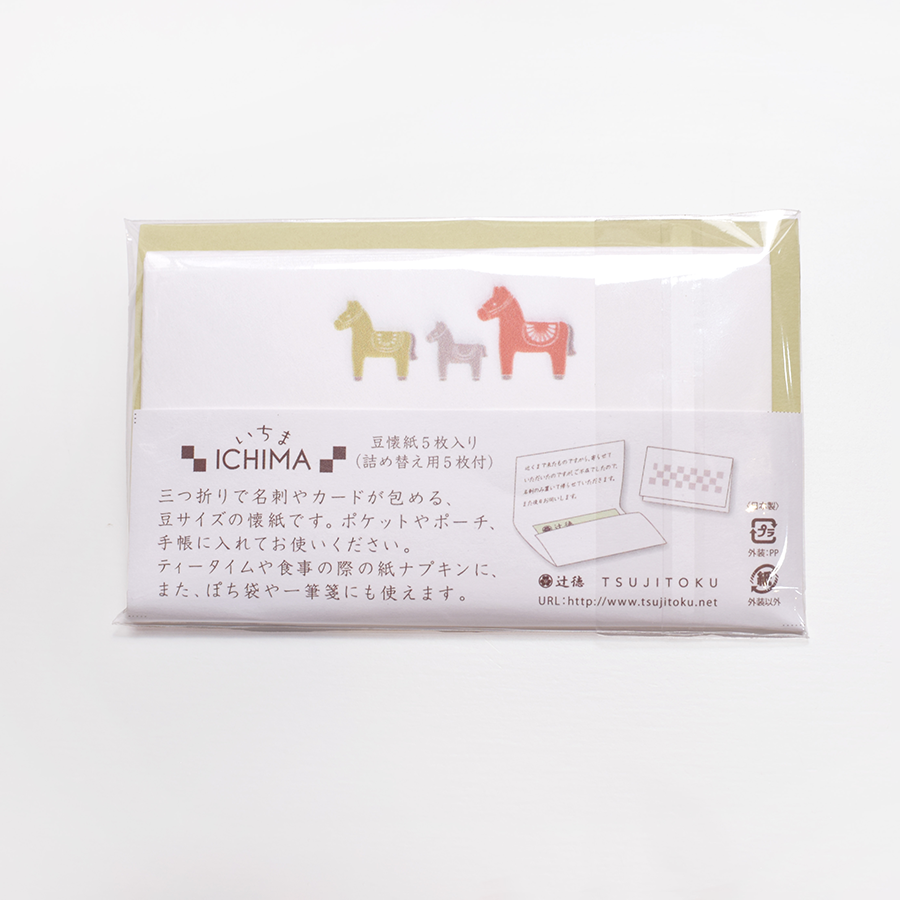 三つ折りで名刺やカードが包める、豆サイズの懐紙、ICHIMA(いちま)に「幸せを運ぶ馬」と「マカロン」のイラストが入った限定バージョンが新登場!